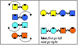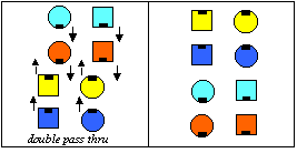 Die einfachste Auflösung der completed double pass thru Formation ist, die Paare abwechselnd nach links oder rechts mit der folgenden Figur zu dirigieren. Merke: mit first go left - next go right bleibt die vorherige Reihenfolge der Paare (in sequence) gleich; mit first go right - next go left ändert sich die Reihenfolge der Paare (out of sequence). |
